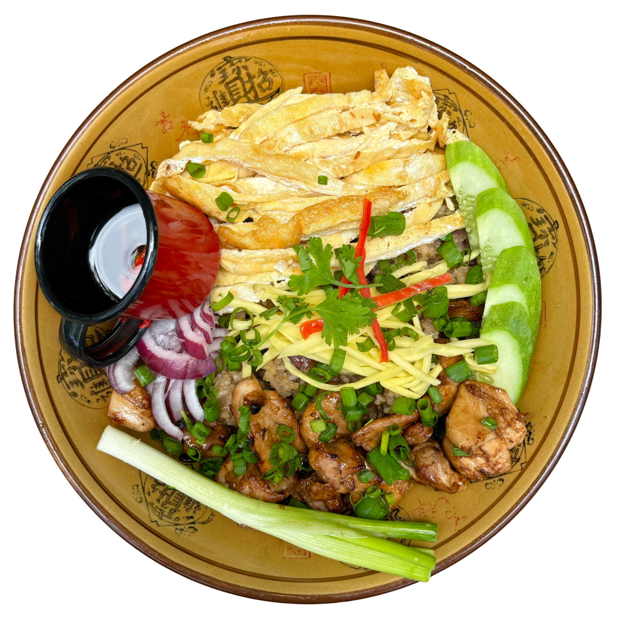 vermicelli noodles • mushrooms • onions • lemongrass • kaffir lime leaves • coriander • choose chicken or shrimp